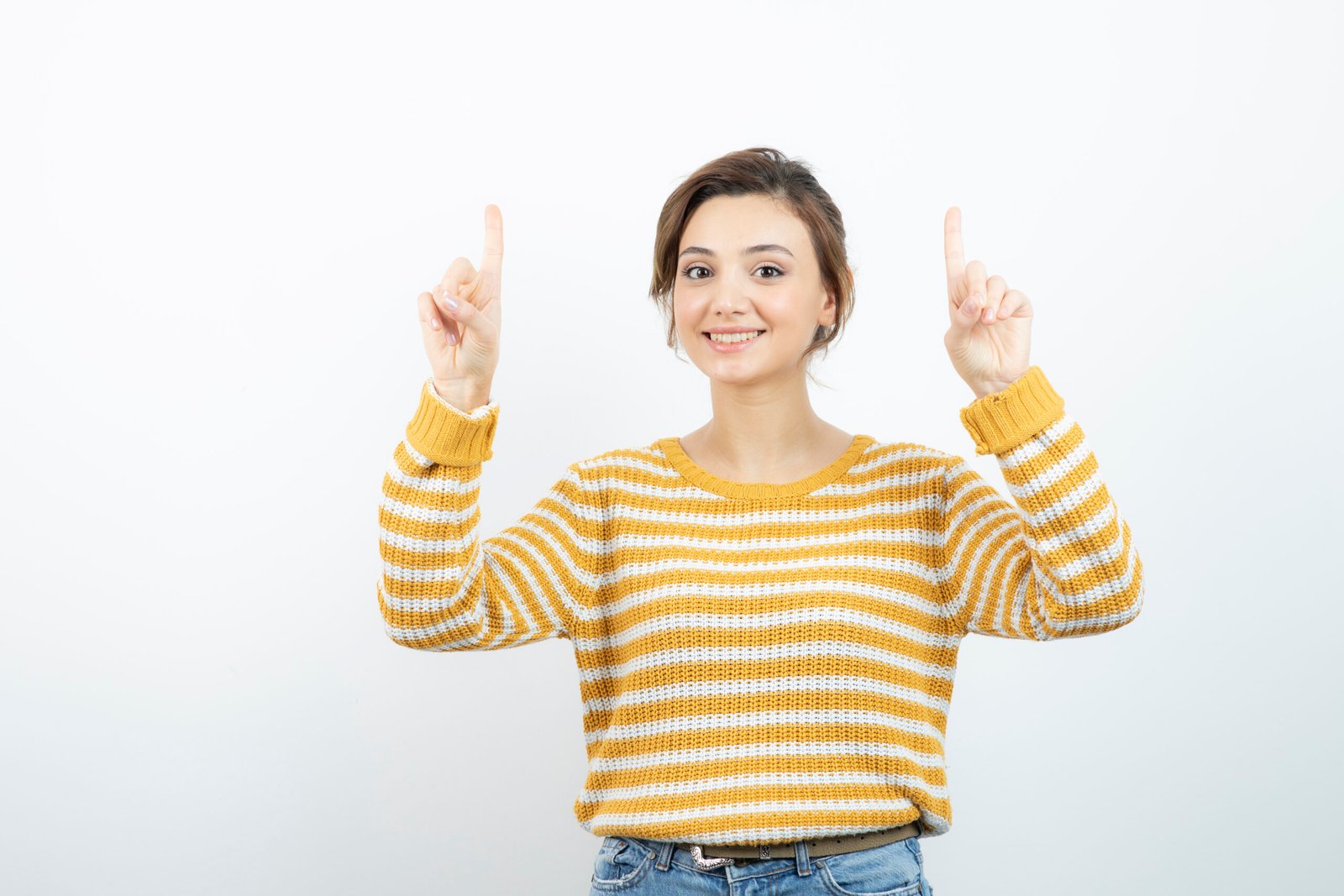 Picture of a young pretty woman model pointing up with fingers . High quality photo